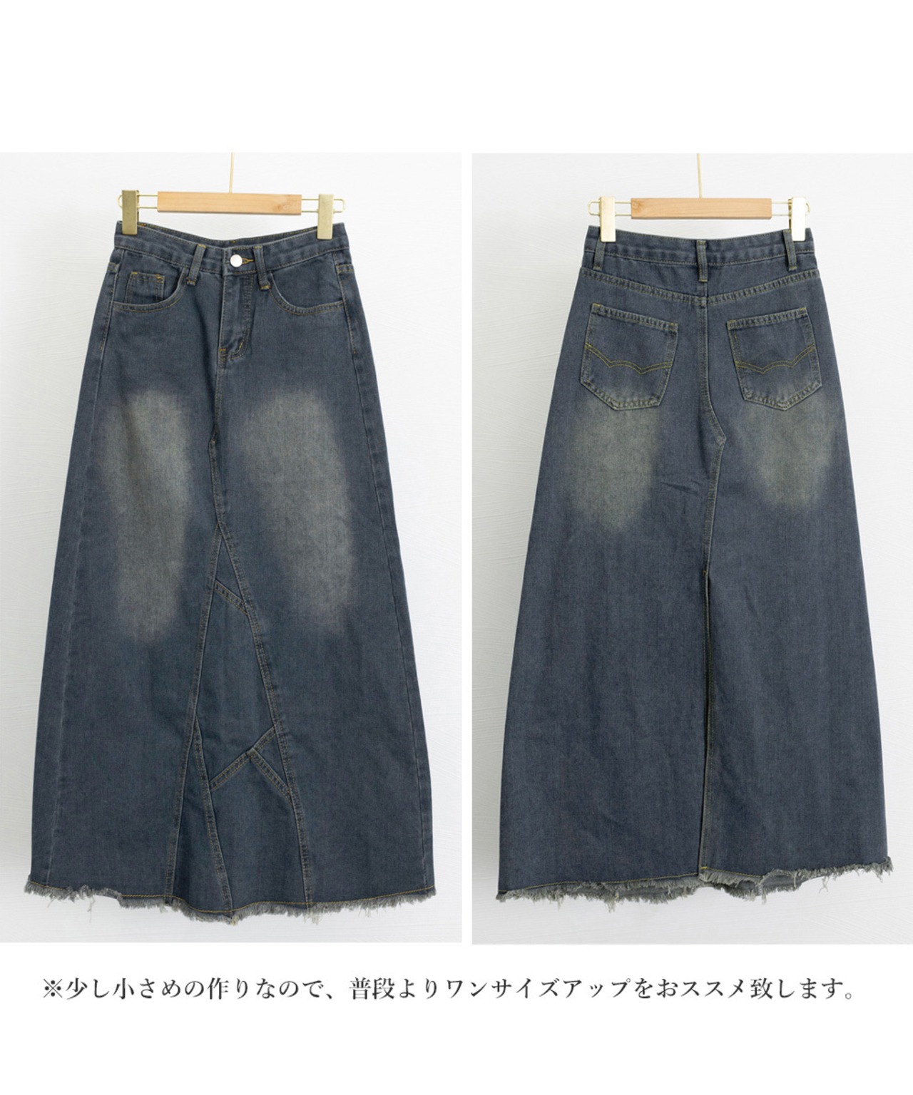 ヴィンテージ デニムスカート レディース 裾フリンジロングスカート ハイウエストAラインスカート 体型カバーブリーチ加工