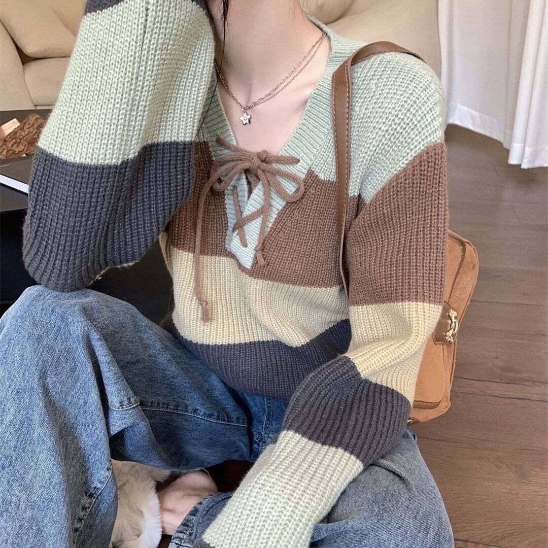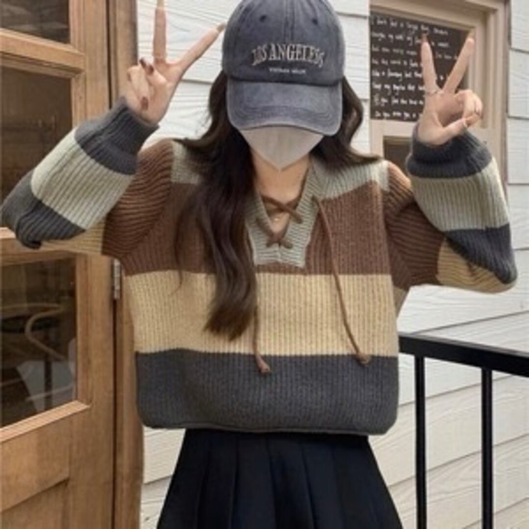 ニット 長袖 ボーダー アースカラー レディース 韓国 カジュアル トップス